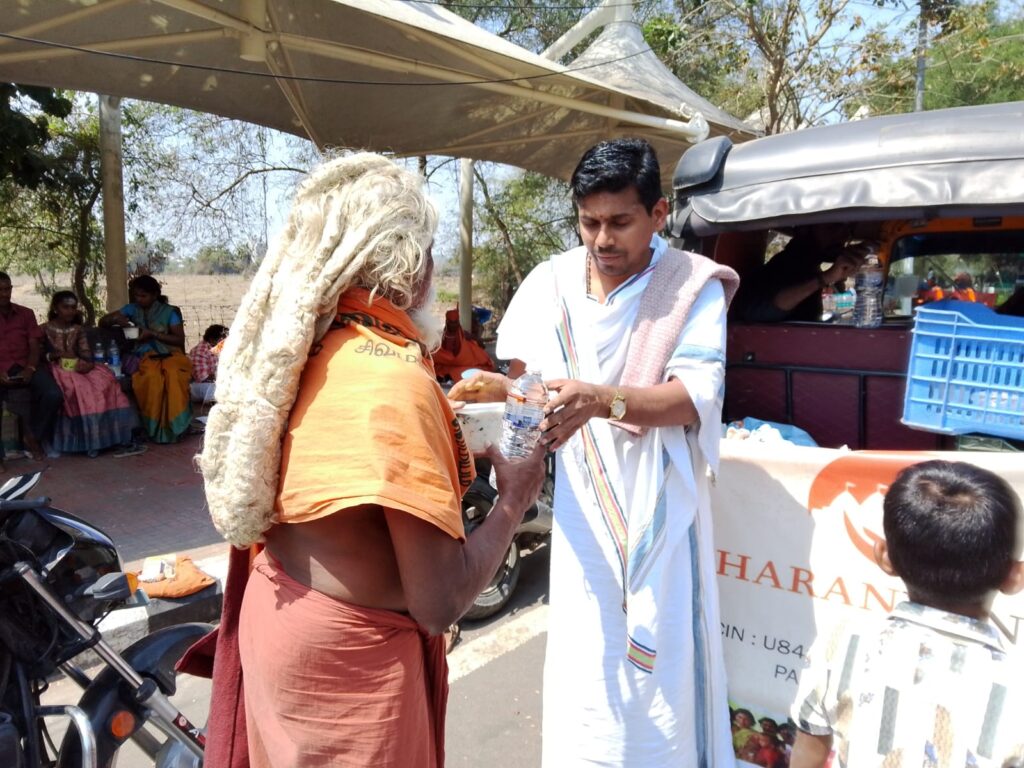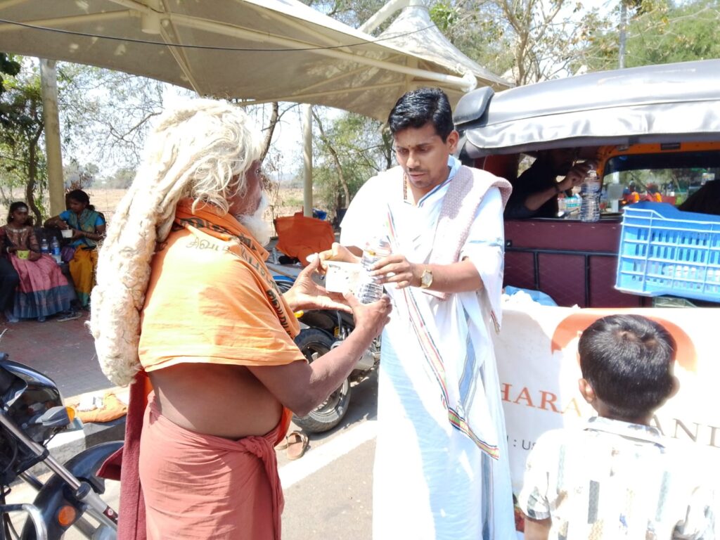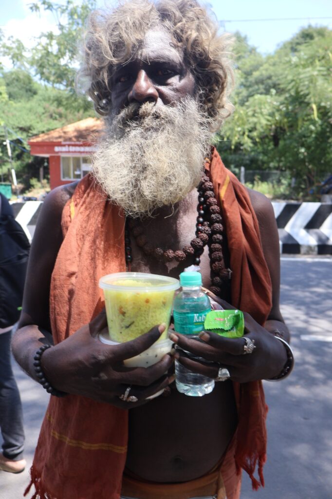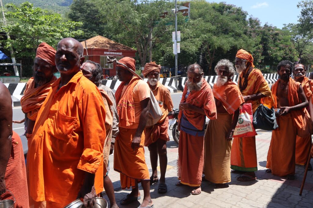 Thousands walk barefoot in Girivalam (circumambulation), many observing fasts, austerity, and silence. Amidst this intense spiritual energy, hunger and exhaustion silently accompany devotion — especially for sadhus, elderly pilgrims, and poor devotees.